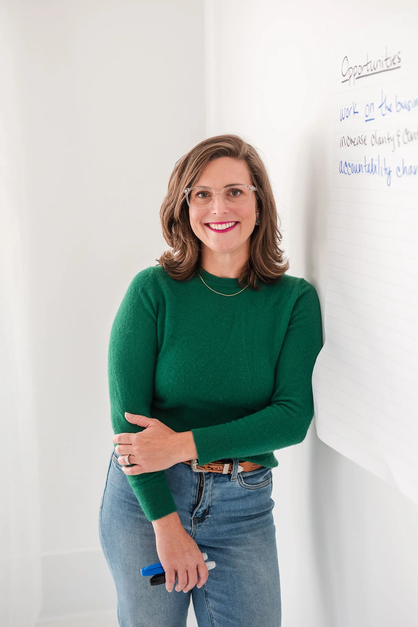 Person in green sweater writing on a large sheet of paper titled "Opportunities" with points including "work on the business," "increase clarify & control," and "accountability chart."